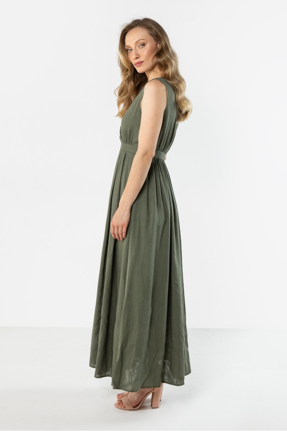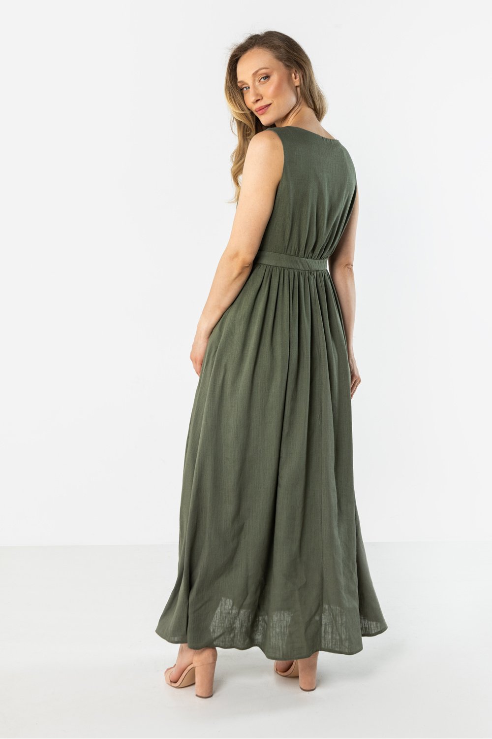 Robe en lin légère et élégante de coupe féminine et intemporelle. Le décolleté croisé en forme de V met joliment en valeur le cou et le décolleté, tandis que la taille cintrée modèle subtilement la silhouette. La jupe évasée se pose librement en mouvement, ajoutant de la légèreté à l’ensemble. Le tissu naturel en lin assure la respirabilité et le confort, donc la robe sera parfaite pour tous les jours, pour les sorties estivales et les occasions de vacances.
