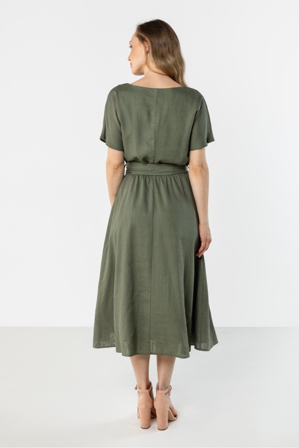 Une robe midi légère dans une coupe féminine et décontractée est une proposition idéale pour les journées chaudes. L’encolure simple souligne subtilement la ligne du cou, tandis que les manches courtes assurent un confort de port. La ceinture à la taille modèle joliment la silhouette et ajoute un caractère élégant à l’ensemble, tandis que le bas évasé se pose doucement en mouvement. Le tissu naturel en lin rend le modèle aéré et convient parfaitement aussi bien pour tous les jours que pour les sorties estivales.