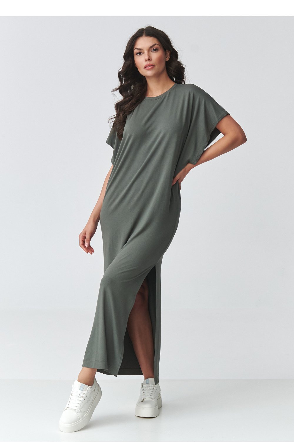 La robe maxi oversize élégante est le parfait mélange de confort et de minimalisme moderne. La coupe ample assure une grande liberté de mouvement, et la coupe simple fait que le modèle s’adapte parfaitement à différents types de silhouette. C’est une proposition idéale pour les femmes qui apprécient le confort et le style intemporel. Le modèle a un décolleté classique et couvert ainsi que des manches courtes et larges, qui soulignent le caractère décontracté de la tenue. La longueur maxi associée à la fente spectaculaire sur le côté ajoute de la légèreté et met subtilement en valeur la jambe, donnant à l’ensemble une expression féminine. Le tissu doux et agréable au toucher fait que la robe pour femme convient parfaitement pour le quotidien, que ce soit au travail, lors de promenades ou de rencontres entre amis. C’est une robe longue et polyvalente avec une fente que vous pouvez styliser de différentes manières, avec des baskets pour un look sportif ou avec des accessoires élégants pour un effet plus chic. Grâce à sa coupe simple, elle constitue une excellente base pour créer des ensembles à la mode tout au long de la saison.