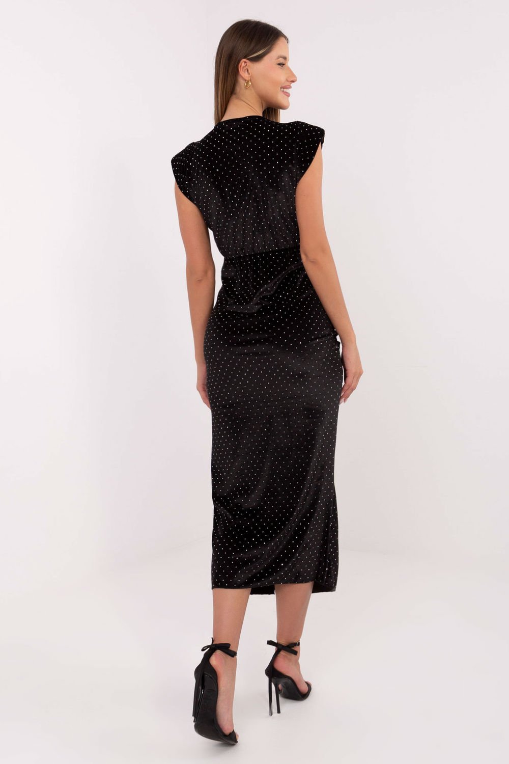 Robe crayon midi élégante et féminine, créée pour des occasions spéciales. Fabriquée à partir d’un mélange de polyester de haute qualité et d’élasthanne, elle offre un ajustement parfait et un grand confort. Le modèle se distingue par des épaulettes cousues qui donnent à la silhouette une forme élégante et distinctive. Le décolleté cache-cœur met joliment en valeur la ligne de buste, tandis que la fente à l’avant met subtilement en valeur la jambe, ajoutant un caractère sensuel à l’ensemble. À l’avant, il y a des plis avec une décoration en métal qui affinent visuellement la taille et constituent un détail spectaculaire. Sans manches, sans fermeture éclair, avec des strass intemporels, idéale pour les sorties habillées, les fêtes et les réceptions élégantes.