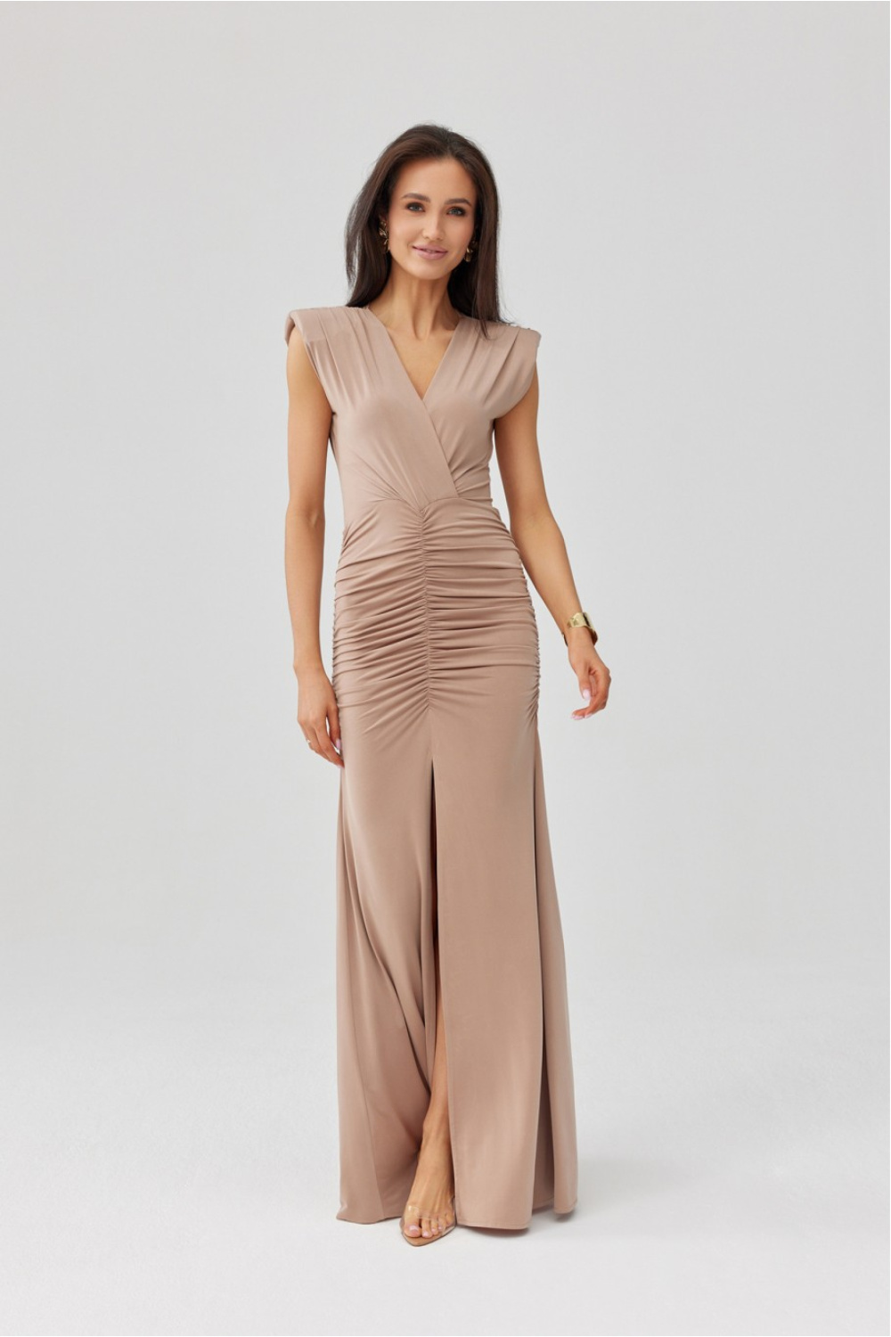 La robe maxi élégante, avec une coupe ajustée, met en valeur la silhouette de manière spectaculaire, tandis que les fronces à la taille accentuent joliment ses formes. Le décolleté cache-cœur et la fente haute sur la jambe ajoutent à la tenue une sensualité féminine et de la légèreté. Ce modèle a été fabriqué en Pologne avec une attention particulière aux moindres détails, garantissant une haute qualité de fabrication et un confort de port. Les épaulettes sont un atout supplémentaire, donnant à l’ensemble un caractère marqué et modelant subtilement la ligne des épaules. C’est le choix parfait pour un mariage, une réception ou une sortie en soirée, il suffit d’ajouter des talons, une pochette et des bijoux pour créer un look élégant et soigné.