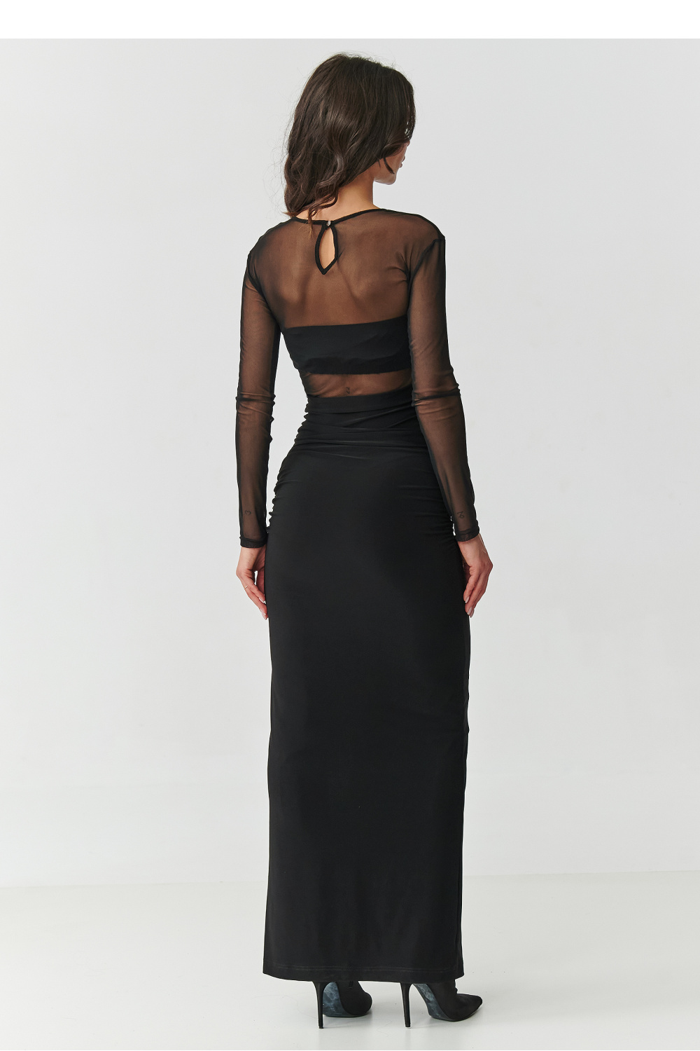Entrez dans le monde de l’élégance qui hypnotise dès le premier regard. Cette robe noire maxi en résille est une proposition pour les femmes qui n’ont pas peur de briller et qui veulent se sentir absolument spéciales. La coupe ajustée souligne parfaitement la silhouette, et les plis subtils à la taille modèlent la figure, lui donnant une légèreté sensuelle. Le haut transparent en résille délicate confère à la robe un caractère mystérieux où l’élégance rencontre le courage. De plus, sous le tulle se trouve un top indépendant que vous pouvez utiliser pour d’autres styles. La fente sensuelle dévoile la jambe à chaque pas, ajoutant un magnétisme féminin à l’ensemble. Le bouton doré à l’arrière remplit non seulement une fonction pratique, mais lui confère également un caractère bijoutier, contrastant magnifiquement avec le noir profond du matériau. Cet accent subtil confère à la robe un aspect luxueux, tout en la rendant unique dans les moindres détails. Ce n’est pas une simple robe de soirée, c’est une création dans laquelle vous sentirez que tous les regards sont tournés vers vous. Parfaite pour un mariage, un bal, une remise de diplôme ou un dîner élégant, elle vous fera toujours vous démarquer par votre style et votre confiance en vous. Audacieuse, hypnotisante, parfaite pour une femme qui veut laisser une impression éblouissante et mémorable, tout comme la robe elle-même.