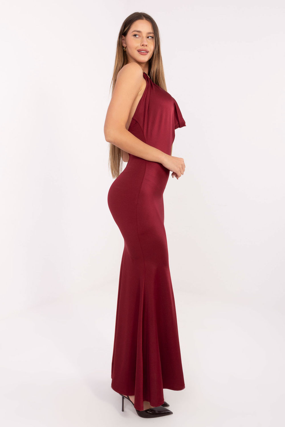Une élégante robe maxi à la coupe sensuelle de sirène, parfaite pour les occasions spéciales et les soirées où le style et l’apparence spectaculaire sont importants. Fabriquée à partir d’un mélange dominant de polyester et de viscose, elle enveloppe subtilement la silhouette, mettant en valeur ses formes et offrant en même temps un confort de port. Le modèle séduit par son motif lisse et minimaliste, qui donne à la tenue classe et caractère intemporel. La robe est sans manches, et attire l’attention avec son profond décolleté fluide, créant une ligne élégante et délicatement exposant les épaules. Un accent particulier est la fixation de la robe au cou avec un anneau en métal, à la fois décoratif et pratique. L’absence de fermeture traditionnelle donne à la robe un aspect fluide et moderne, sa forme reste intacte sans éléments supplémentaires. C’est le choix idéal pour les femmes qui veulent se démarquer par leur élégance alliée à une ligne moderne et audacieuse.
