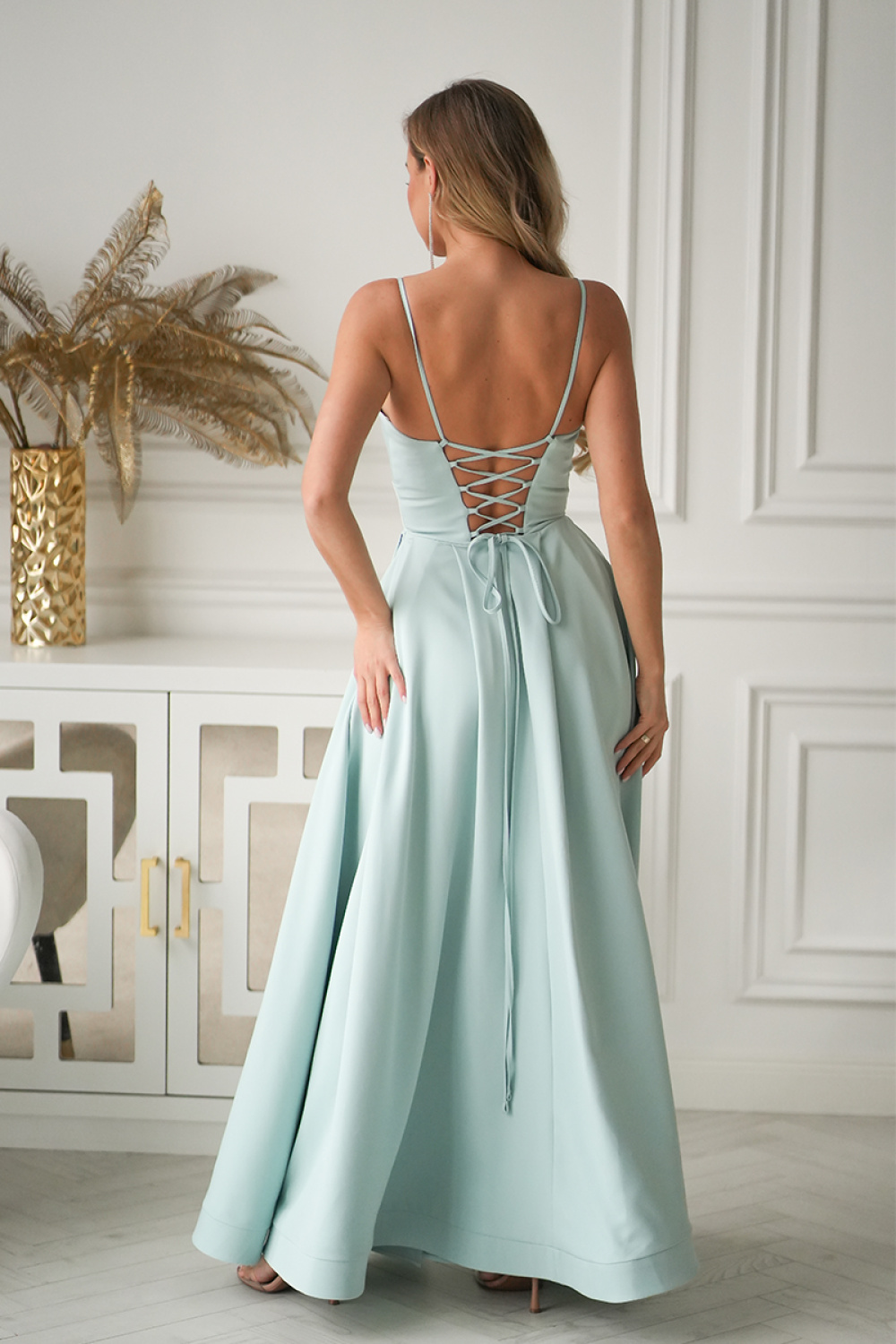 Robe de style bal, fabriquée dans un tissu doux. La large jupe élégamment disposée lui donne un aspect luxueux, et les poches cachées dans la jupe ajoutent de la praticité. Laçage sensuel corset dans le dos met joliment en valeur la taille. Robe fermée par une fermeture éclair dissimulée. Parfait pour le bal de fin d’année, le mariage et autres occasions spéciales.