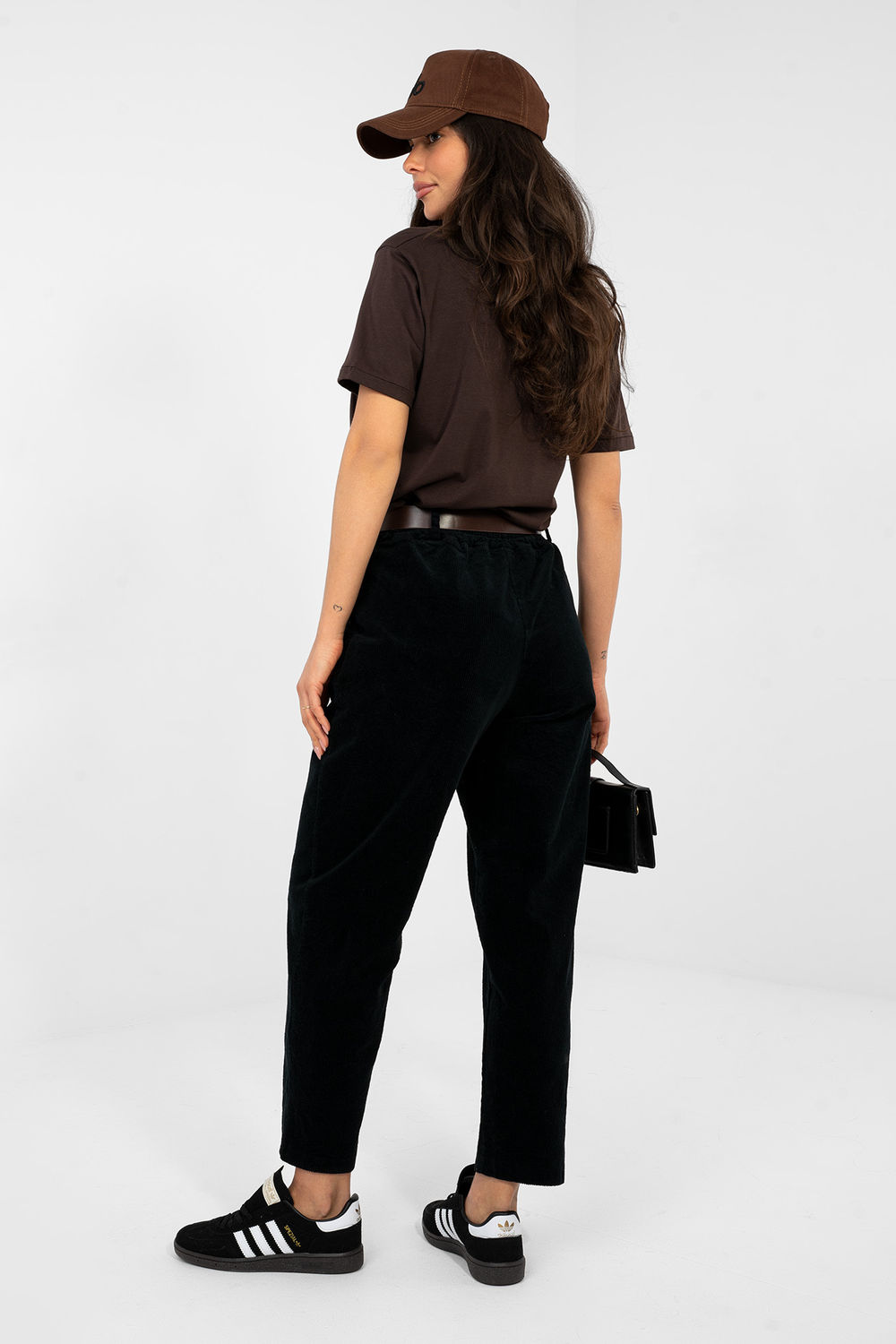 Les pantalons en velours côtelé de type carotte sont une proposition confortable et élégante pour les tenues quotidiennes et de bureau dans un style décontracté. Fabriqués à partir d’un mélange de coton et d’élasthanne, ils offrent un confort de port, une élasticité et un bon ajustement à la silhouette. Le motif lisse et les jambes fuselées de longueur 7/8 donnent à l’ensemble un caractère moderne. Le modèle à taille haute, avec une bande élastique cousue à la taille, garantit le confort toute la journée, et est également équipé d’une ceinture à fermeture éclair qui souligne la taille. Les poches latérales augmentent la fonctionnalité du pantalon. L’absence de fermeture classique rend les pantalons faciles à enfiler et conviennent parfaitement aux tenues quotidiennes et aux tenues de travail.