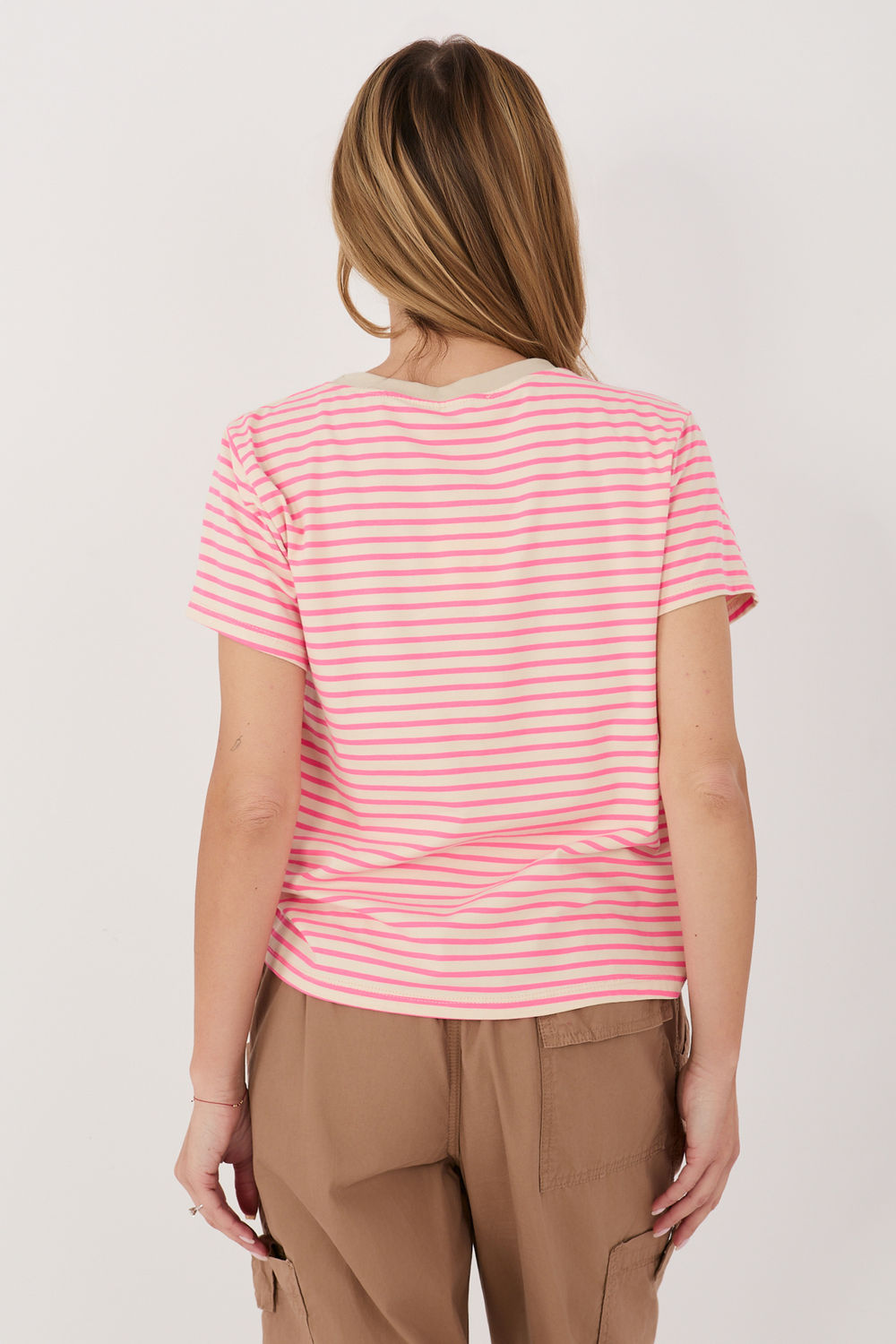 Élégant t-shirt pour femmes à rayures intemporelles, parfait pour des tenues décontractées au quotidien. Le motif classique se marie parfaitement aussi bien avec des jeans qu’avec des pièces plus élégantes de la garde-robe. Fabriqué à partir d’un mélange de coton de haute qualité et d’élasthanne, il assure un confort de port, une douceur et un bon ajustement à la silhouette. Sa longueur standard et ses manches courtes en font un choix polyvalent pour toutes les saisons. Le modèle a un col rond qui souligne le caractère classique du t-shirt. Le tout est complété par une broderie subtile en forme de cœur, placée sur le côté gauche à hauteur de la poitrine, ajoutant du charme et une touche féminine.
