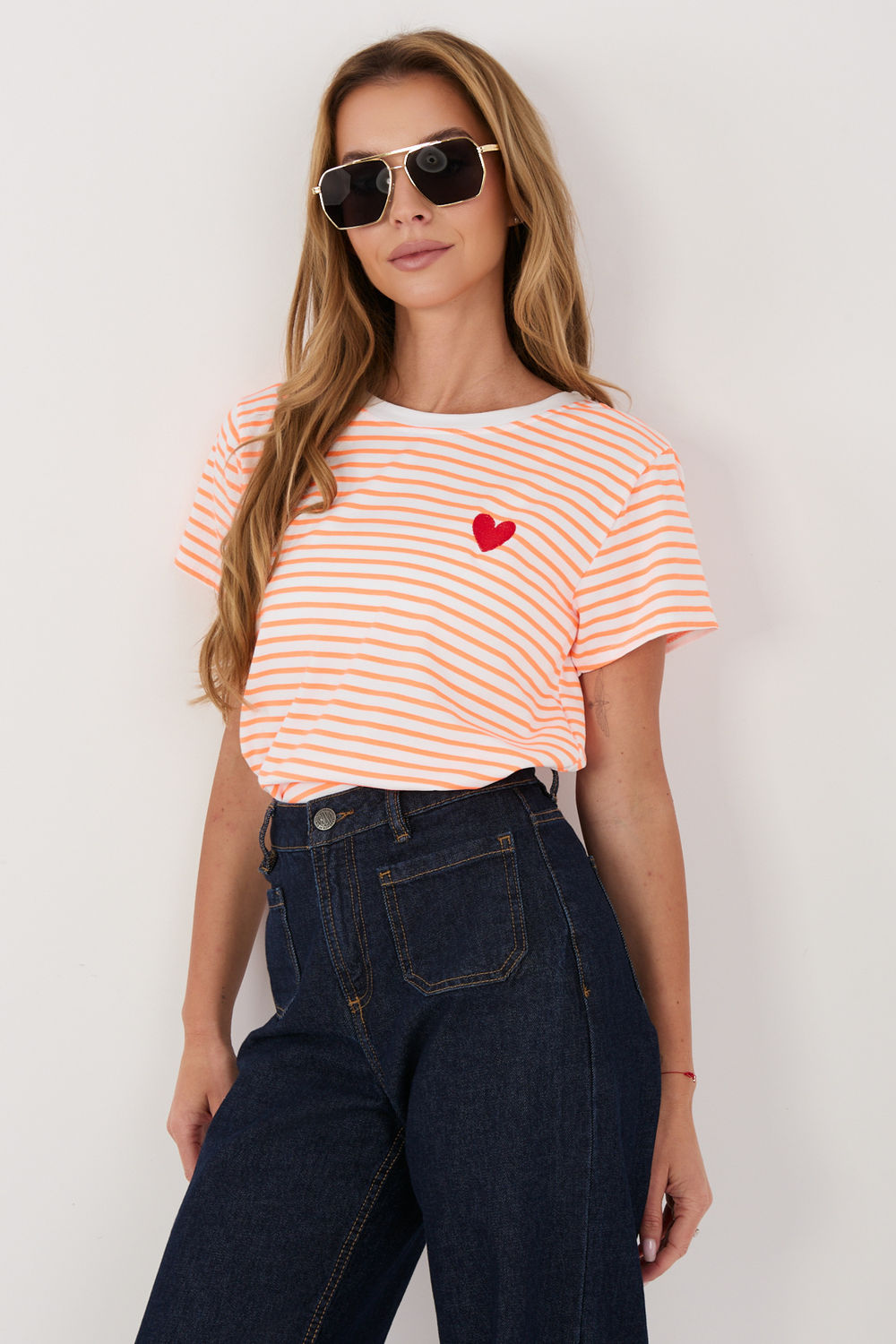 Élégant t-shirt à rayures intemporelles pour femmes, idéal pour des tenues décontractées au quotidien. Le motif classique se marie parfaitement avec des jeans et des pièces plus élégantes de la garde-robe. Fabriqué à partir d’un mélange de coton et d’élasthanne de haute qualité, il assure un confort de port, une douceur et un bon ajustement à la silhouette. La longueur standard et les manches courtes en font un choix polyvalent pour toutes les saisons. Le modèle a un col rond qui souligne le caractère classique du t-shirt. Le tout est complété par une broderie subtile en forme de cœur, placée sur le côté gauche à hauteur de la poitrine, ajoutant du charme et une touche féminine.