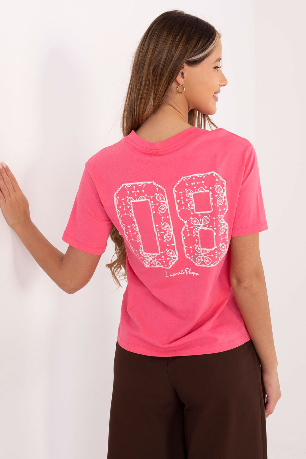 Ce t-shirt décontracté pour femme est le choix idéal pour celles qui apprécient la simplicité avec une touche de style prononcé. Sur le devant, il y a une petite inscription au niveau de la poitrine, qui souligne subtilement le caractère du t-shirt, tandis qu’à l’arrière se trouve une grande impression avec un texte, donnant à l’ensemble un look moderne et accrocheur. Le t-shirt est fabriqué en coton de haute qualité, ce qui le rend doux, respirant et confortable à porter. Sa longueur standard, ses manches courtes et son col rond font que le t-shirt s’ajuste parfaitement à la silhouette et se marie bien avec de nombreuses tenues du quotidien. Polyvalent, élégant et confortable, c’est une excellente base pour des tenues décontractées.