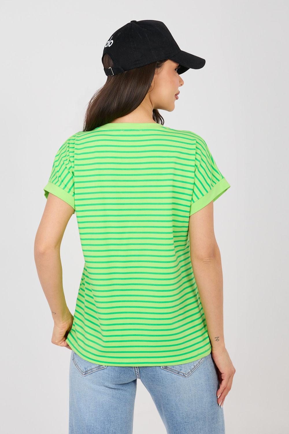 Le t-shirt classique pour femme dans un style décontracté, idéal pour tous les jours et différentes occasions quotidiennes. Ce modèle de longueur standard a des manches courtes et un col rond, qui assurent confort et liberté de mouvement. L’élément dominant du t-shirt est les rayures, donnant à l’ensemble un caractère à la mode et intemporel. Fabriqué en coton de haute qualité avec une touche d’élasthanne, le matériau est doux, agréable au toucher et légèrement élastique, ce qui garantit un confort toute la journée. Il s’agit d’un modèle polyvalent et pratique, qui se marie facilement avec des jeans, des jupes et des shorts, créant des ensembles élégants au quotidien.
