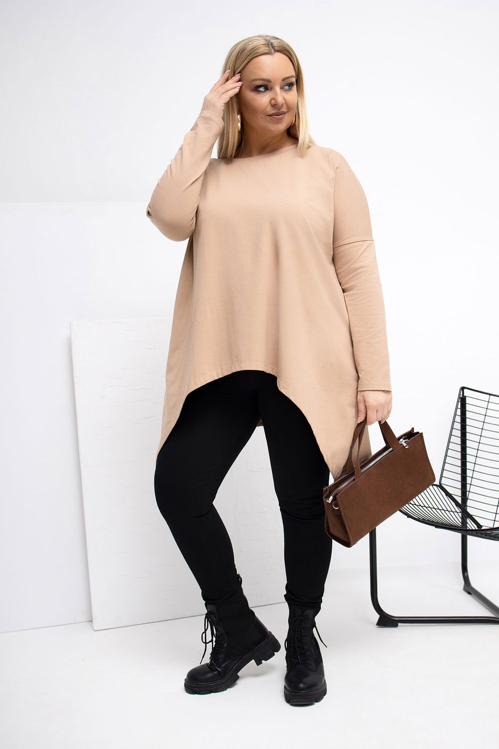 Chemisier grande taille pour femme est une proposition confortable et stylée, idéale pour les tenues décontractées au quotidien. Fabriqué en coton de haute qualité avec une touche d’élasthanne, il est doux, élastique et agréable pour la peau, offrant un confort de port toute la journée. Le tissu lisse lui confère un caractère universel et permet de l’adapter facilement à différentes pièces de la garde-robe. Le modèle se distingue par sa coupe longue et son ourlet asymétrique, qui affinent subtilement la silhouette et ajoutent une touche de style moderne. L’absence de fermeture met en valeur la coupe décontractée du chemisier, tandis que les poches pratiques dissimulées dans les coutures latérales augmentent sa fonctionnalité. C’est un choix parfait pour le quotidien au travail, en promenade ou pour une rencontre en petit comité informel, alliant confort et style à la mode.