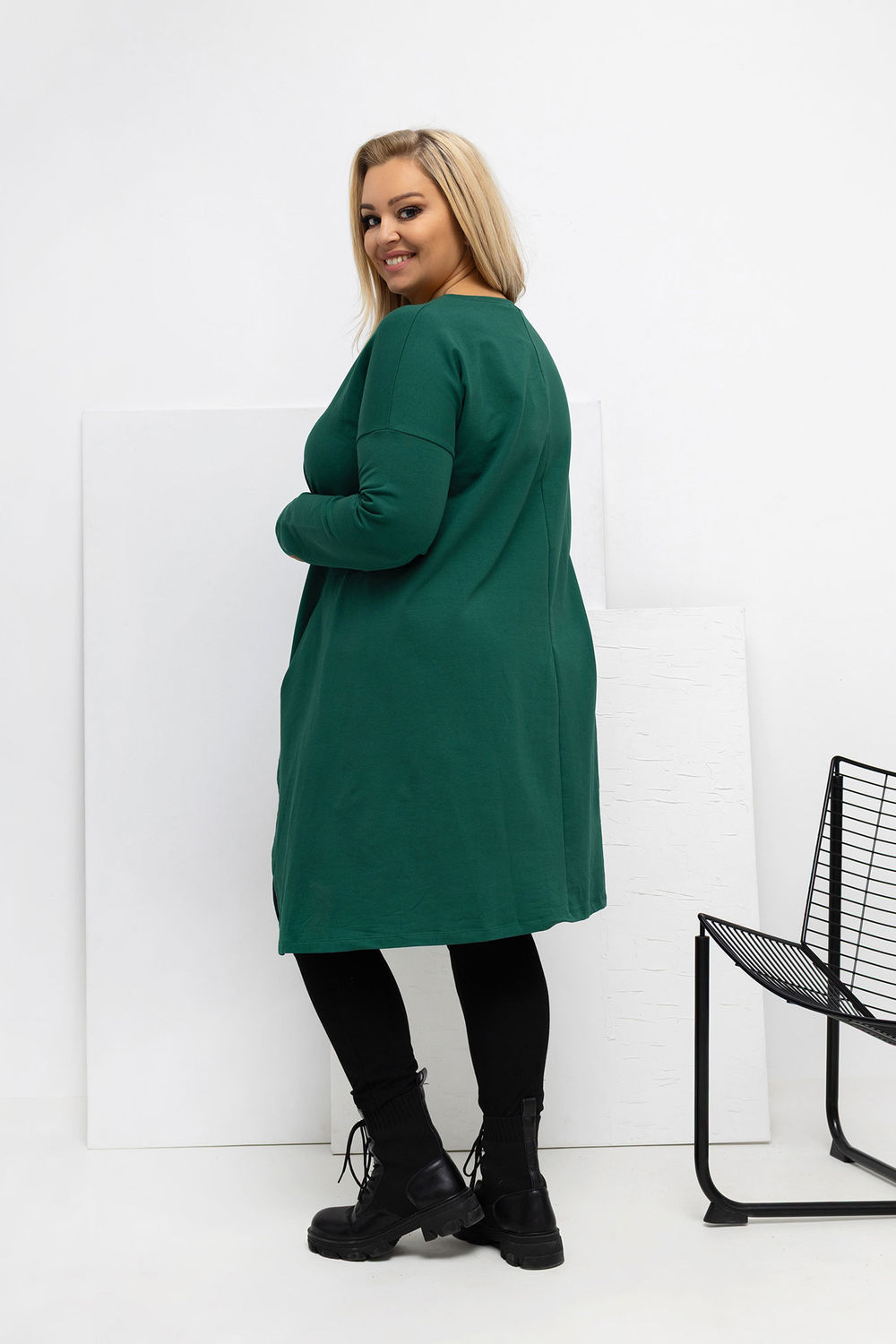 La tunique élégante de grande taille à la coupe prolongée et asymétrique est une excellente proposition pour les femmes appréciant le confort et l’apparence moderne. Fabriquée dans un matériau doux et agréable au toucher, elle se pose magnifiquement sur la silhouette, offrant une grande liberté de mouvement et affinant subtilement la silhouette. Le modèle combine le style de la tunique et de la robe asymétrique, ce qui en fait un excellent choix aussi bien avec des leggings que porté seul, en robe ample. Le décolleté classique et rond met en valeur le cou et s’adapte à toutes les tenues. Manches longues, idéales pour les jours plus frais. Poches pratiques dissimulées dans les coutures latérales, ajoutant confort et fonctionnalité. À l’avant, en bas, se trouve une petite étiquette qui ajoute une touche de caractère à l’ensemble. La tunique se met par la tête, assurant une mise rapide et confortable. Moderne, confortable et élégante, elle complétera parfaitement vos tenues quotidiennes, et sa coupe prolongée et asymétrique mettra parfaitement en valeur les atouts de la silhouette plus size.