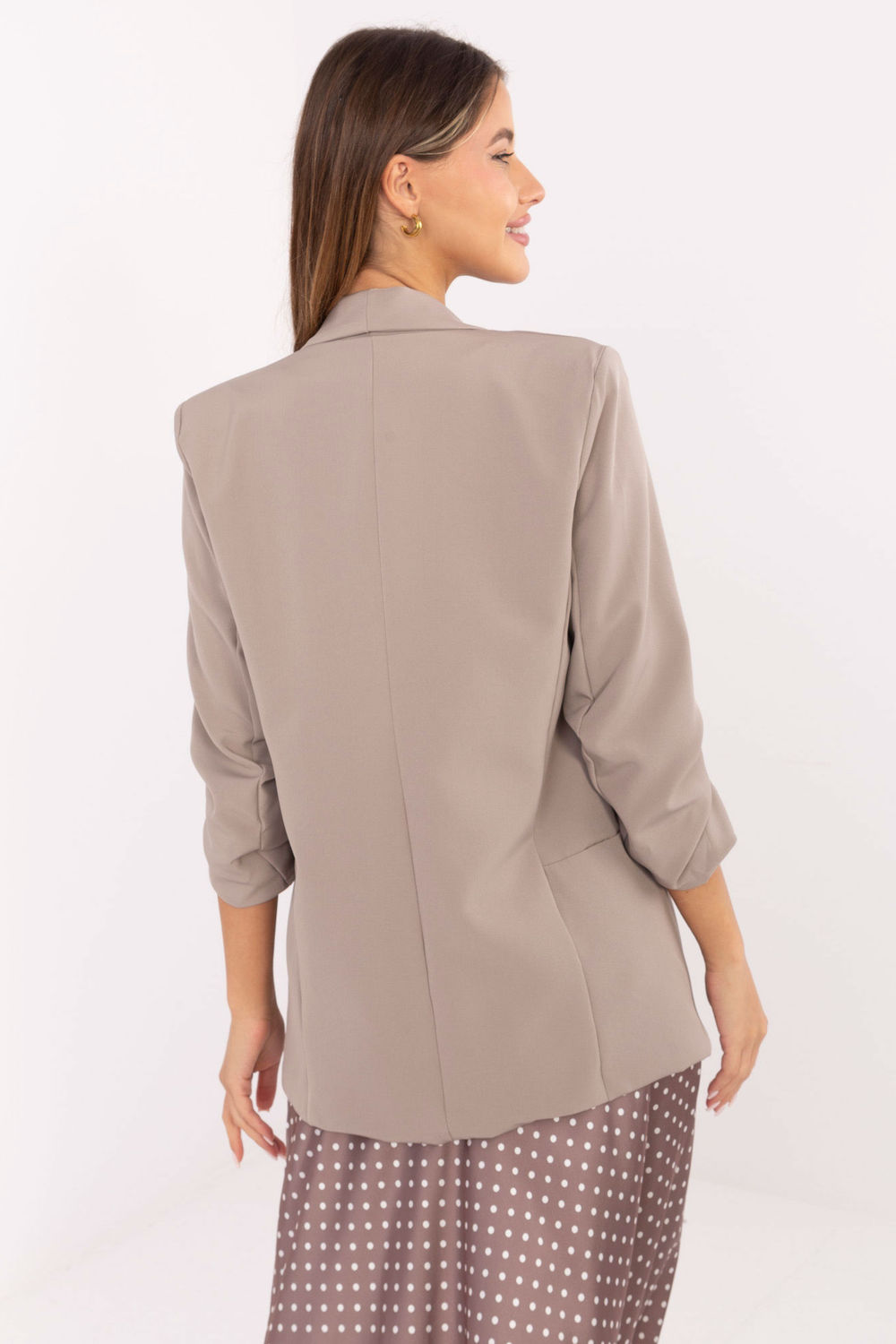 La veste de blazer élégante pour femmes est un élément classique de la garde-robe qui ajoutera de l’élégance à n’importe quelle tenue, que ce soit pour le travail ou pour des occasions spéciales. Fabriquée dans un mélange élastique de polyester et d’élasthanne, elle s’ajuste parfaitement à la silhouette, offrant un grand confort. Le modèle est doté d’épaulettes intégrées qui soulignent subtilement la ligne des épaules, tandis que les plis sur les manches ajoutent un caractère moderne et de la légèreté à l’ensemble. Les manches 3/4 et la longueur standard rendent la veste polyvalente et élégante dans toutes les situations. Sans fermeture, avec une doublure pratique, elle constitue une base élégante pour de nombreux ensembles, des tenues quotidiennes aux tenues de bureau et plus formelles.