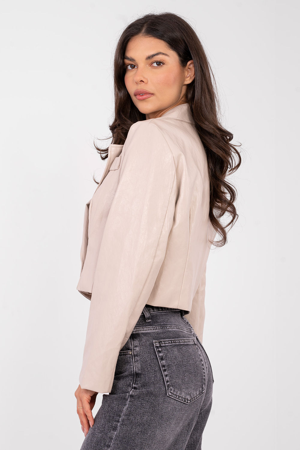 Blazer élégant pour femme fabriqué en simili cuir de haute qualité à base de viscose et de polyuréthane, idéal pour les tenues quotidiennes et le travail. Le caractère décontracté du modèle le rend parfait pour mélanger l’élégance avec un style moderne et urbain. Le tissu lisse souligne la polyvalence du blazer et lui donne un aspect intemporel. Modèle de longueur courte, avec des manches longues et des revers à encoche, boutonné de manière croisée. Les épaulettes discrètes soulignent subtilement la ligne des épaules et donnent à la silhouette une forme prononcée. Le blazer est doublé pour plus de confort. Sans doublure ni rembourrage, c’est un choix idéal pour l’automne, l’hiver et le printemps, que ce soit pour le bureau ou pour tous les jours.