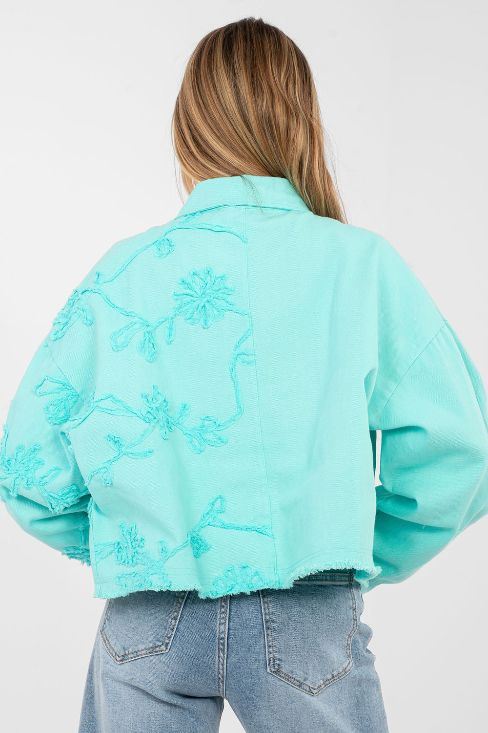 Veste en jean pour femme élégante dans une version décontractée, parfaite pour tous les jours. Fabriqué en coton de haute qualité, il offre un confort de port et un caractère universel. Modèle de longueur courte avec un col classique et des manches longues, boutonné. Le bas de la veste est fini avec une frange à la mode qui donne à l’ensemble une touche légèrement rocheuse. L’originalité est ajoutée par des fleurs brodées placées sur le côté gauche de la veste à l’avant, sur la manche et dans le dos, créant un détail spectaculaire et féminin. La poche pratique sur le côté droit à la hauteur de la poitrine souligne le caractère utilitaire du modèle. Un excellent choix pour les tenues quotidiennes, que ce soit avec une robe, un jean ou une jupe.