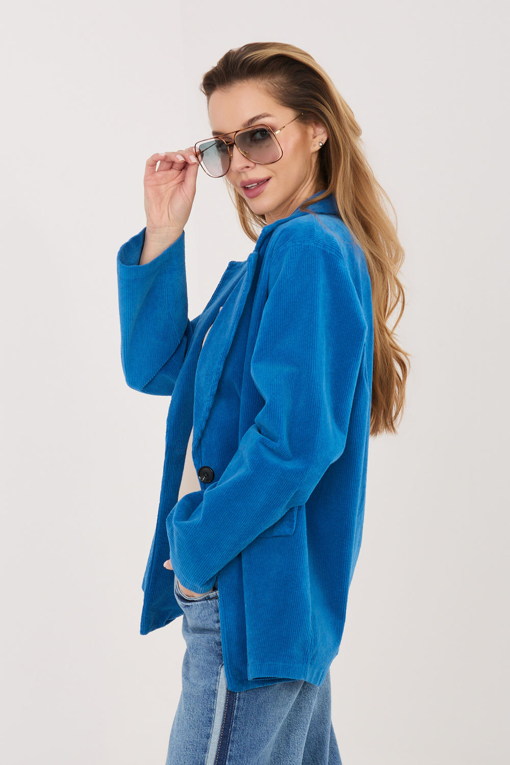 Une élégante veste en velours côtelé pour femme dans une version décontractée, qui sera parfaite aussi bien au quotidien qu’au travail. Ce modèle allie liberté et élégance, ce qui vous permettra de l’adapter facilement à de nombreuses tenues, des pantalons classiques aux jeans en passant par une jupe crayon. Fabriquée en coton de haute qualité avec une touche d’élasthanne, elle assure un confort de port et une souplesse délicate, ce qui se traduit par un confort toute la journée. Son motif lisse met en valeur son caractère polyvalent, tandis que sa texture côtelée ajoute une subtile structure et une touche tendance. Le modèle possède des manches longues et des revers classiques qui confèrent à la veste un style intemporel. Sa longueur standard flatte la silhouette, et sa fermeture à un bouton souligne son élégant design. Les poches factices sont une finition esthétique, conservant le caractère minimaliste du projet. C’est une proposition idéale pour les femmes qui apprécient le confort, le style et la fonctionnalité dans leurs tenues quotidiennes et professionnelles.