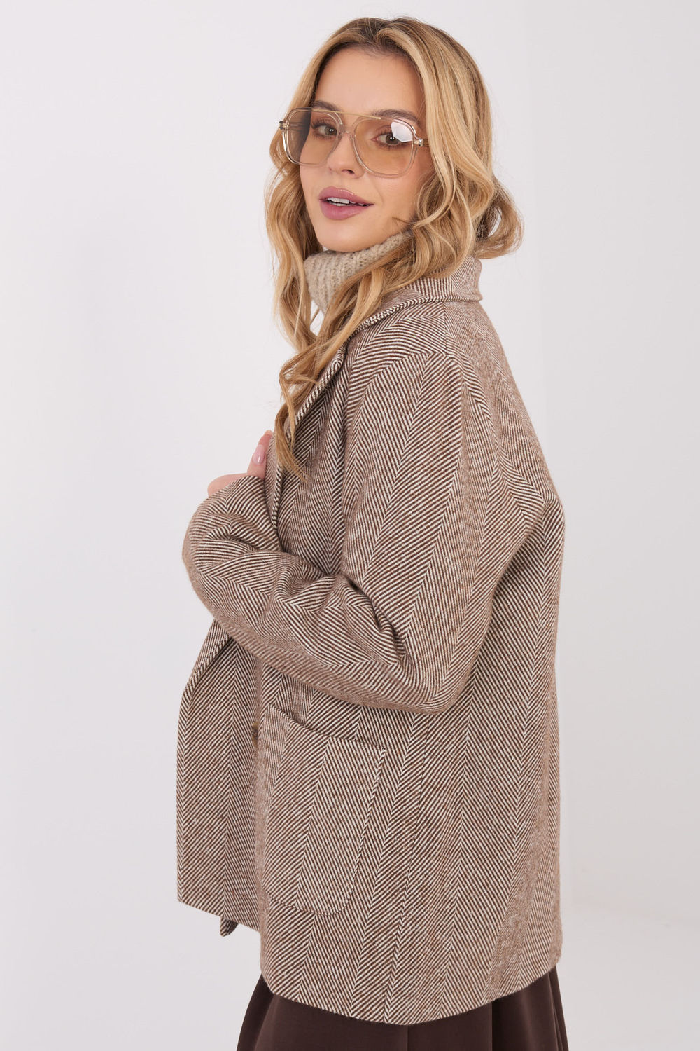 La veste pour femme de style casual est un excellent mélange d’élégance et de confort, idéal pour tous les jours et pour travailler en automne/hiver. Le modèle est fabriqué à partir d’un mélange de cachemire de haute qualité avec une touche d’élasthanne, ce qui assure un confort de port, une douceur et une légère élasticité du matériau. La veste se distingue par un motif de chevrons classique qui confère à l’ensemble un caractère intemporel. Longueur standard, manches longues et boutonnage double à boutons soulignent la coupe élégante et font que le modèle est très élégant tout en restant décontracté. La veste est doublée pour un meilleur confort de port, et possède des poches plaquées ajoutant fonctionnalité et une touche décontractée. La veste n’est pas rembourrée, ce qui en fait un excellent choix comme couche extérieure les jours plus froids ou comme élément de superposition dans des tenues superposées. C’est un choix polyvalent qui complétera parfaitement les ensembles classiques et plus décontractés.