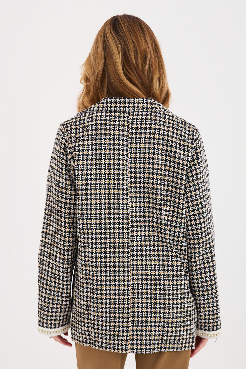 La veste en tweed à coupe élégante et classique, fabriquée en coton de haute qualité, parfaite pour les saisons automne, hiver et printemps. Modèle de longueur standard, avec des manches longues et une fermeture à double boutonnage. Revers, poignets et poches passepoilées ornés de perles subtiles, ajoutant de l’élégance et du caractère féminin à la veste. La veste est doublée, avec un motif à carreaux lisse et sans rembourrage, ce qui la rend adaptée aussi bien pour les tenues de tous les jours que pour les occasions spéciales, au travail et pour des événements élégants.