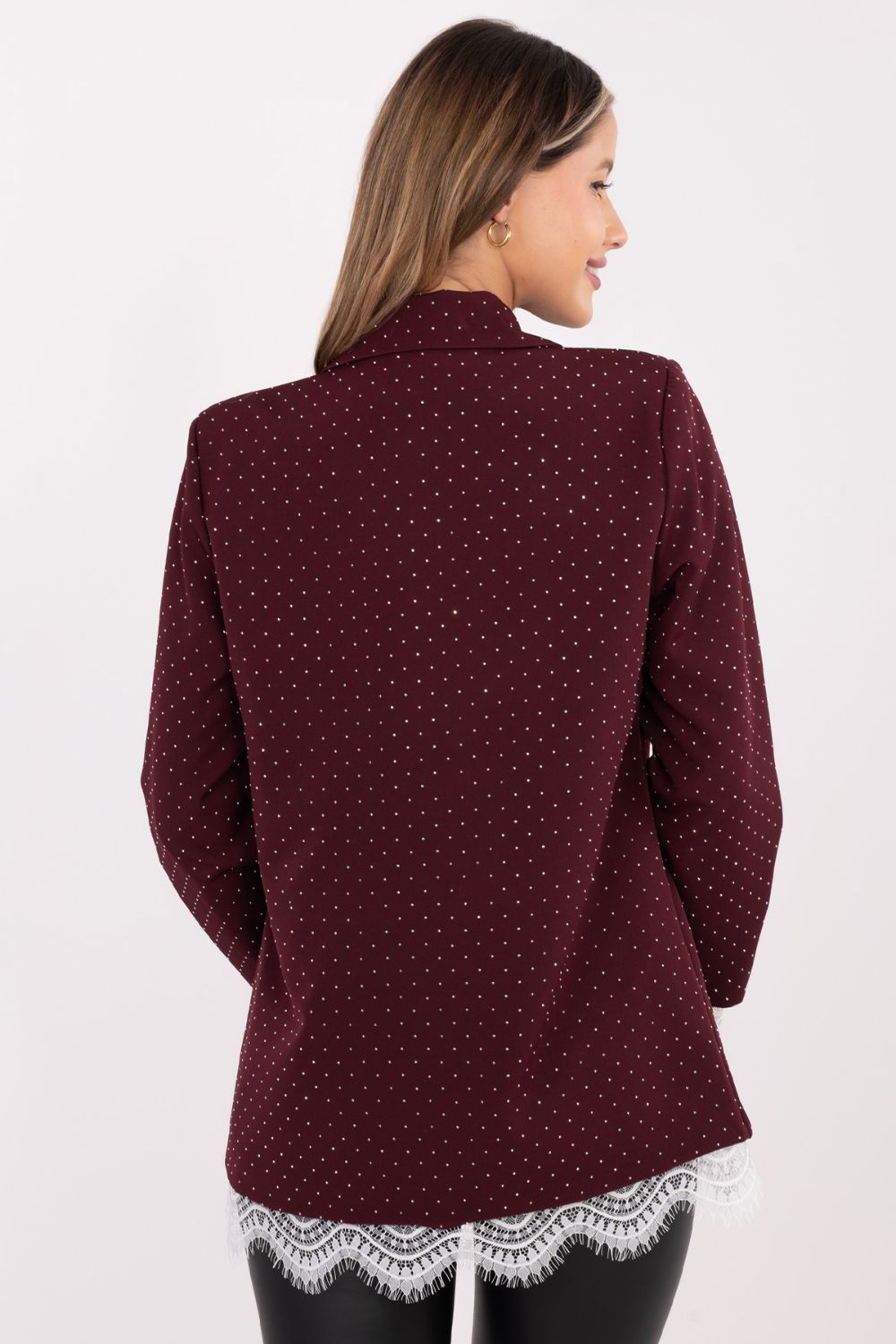 Une veste de costume élégante pour femme est une proposition exceptionnelle pour les occasions formelles et festives, idéale pour les femmes qui apprécient le style et les détails spectaculaires. Ce modèle de longueur standard séduit par sa finition soignée et son caractère raffiné. La veste a des revers, des épaulettes cousues et une fermeture à un bouton, mettant en valeur la forme classique et la ligne élégante de la silhouette. Toute la surface du tissu est ornée d’une application de strass, donnant à l’ensemble un effet luxueux et bijoutier et attirant le regard. Un accent particulier est la finition en dentelle en bas de la veste et sur les manches longues, qui ajoute de la légèreté et du charme féminin. Ce modèle, fabriqué à partir d’un mélange de polyester et d’élasthanne, assure un confort de port et une bonne adaptation à la silhouette. La doublure augmente le confort et fait que la veste se porte parfaitement sur le corps. C’est un excellent choix pour les femmes à la recherche d’une veste élégante et spectaculaire pour des occasions spéciales.